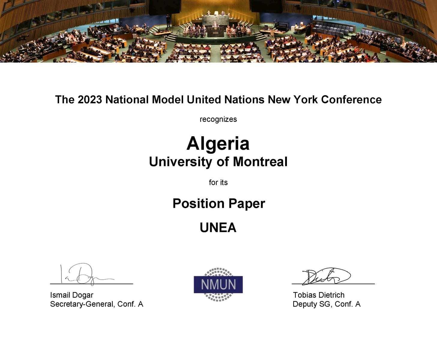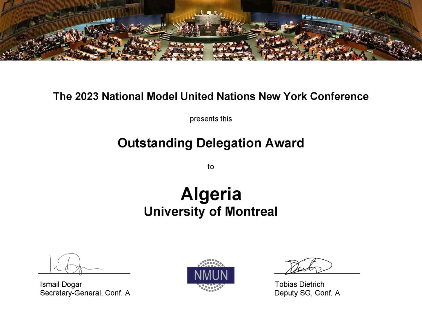 L’Ambassadeur d’Algérie au Canada, Dr. Noureddine Bardad-daidj, félicite chaleureusement la délégation des Nations Unies de l’université de Montréal (Udem) qui a représenté l’Algérie à la grande simulation onusienne, tenue du 1er au 8 avril, à New York et remporté les plus hautes distinctions de la simulation, notamment le « Outstanding Delegation Award » et le « Position Paper Award » dans plusieurs Commissions de l’Assemblée Générale.