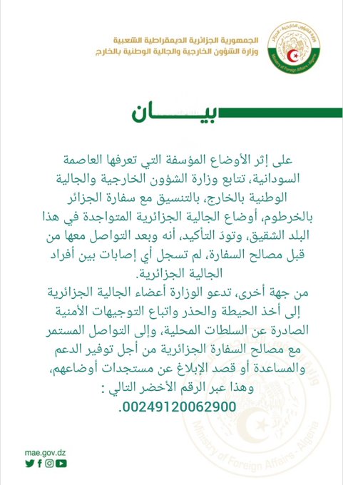 Le Président Tebboune a appelé à une action commune et urgente en vue d'éviter davantage d'escalade et mettre un terme aux combats entre les frères soudanais, en les amenant à faire prévaloir la sagesse et à privilégier le dialogue dans la résolution de leurs différends, tout en évitant au peuple soudanais les risques de s'engager dans la spirale de la violence meurtrière qui constitue un danger à la fois pour la paix sociale et pour le processus de règlement politique au Soudan.