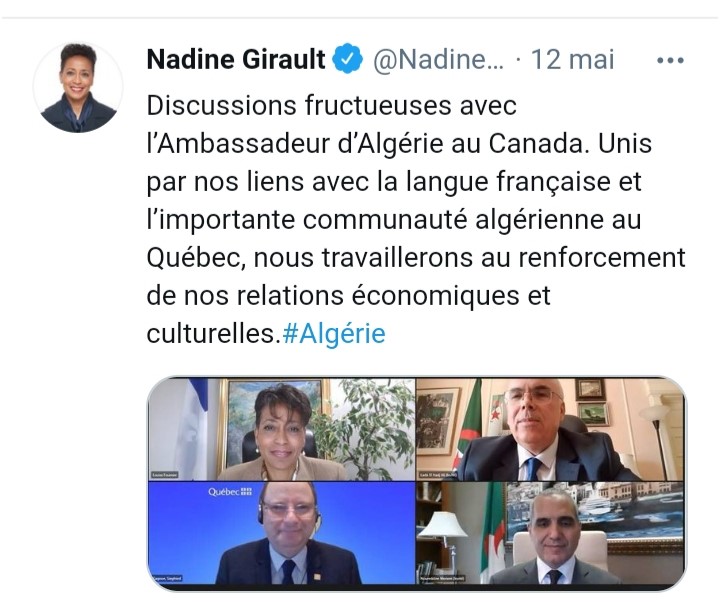 M. l'Ambassadeur a eu, le 12 mai 2021, un entretien avec Mme Nadine Girault, Ministre des Relations Internationales du Québec, consacré à l'examen de l'état des relations de coopération entre l'Algérie et Québec, leur développement et leur diversification.