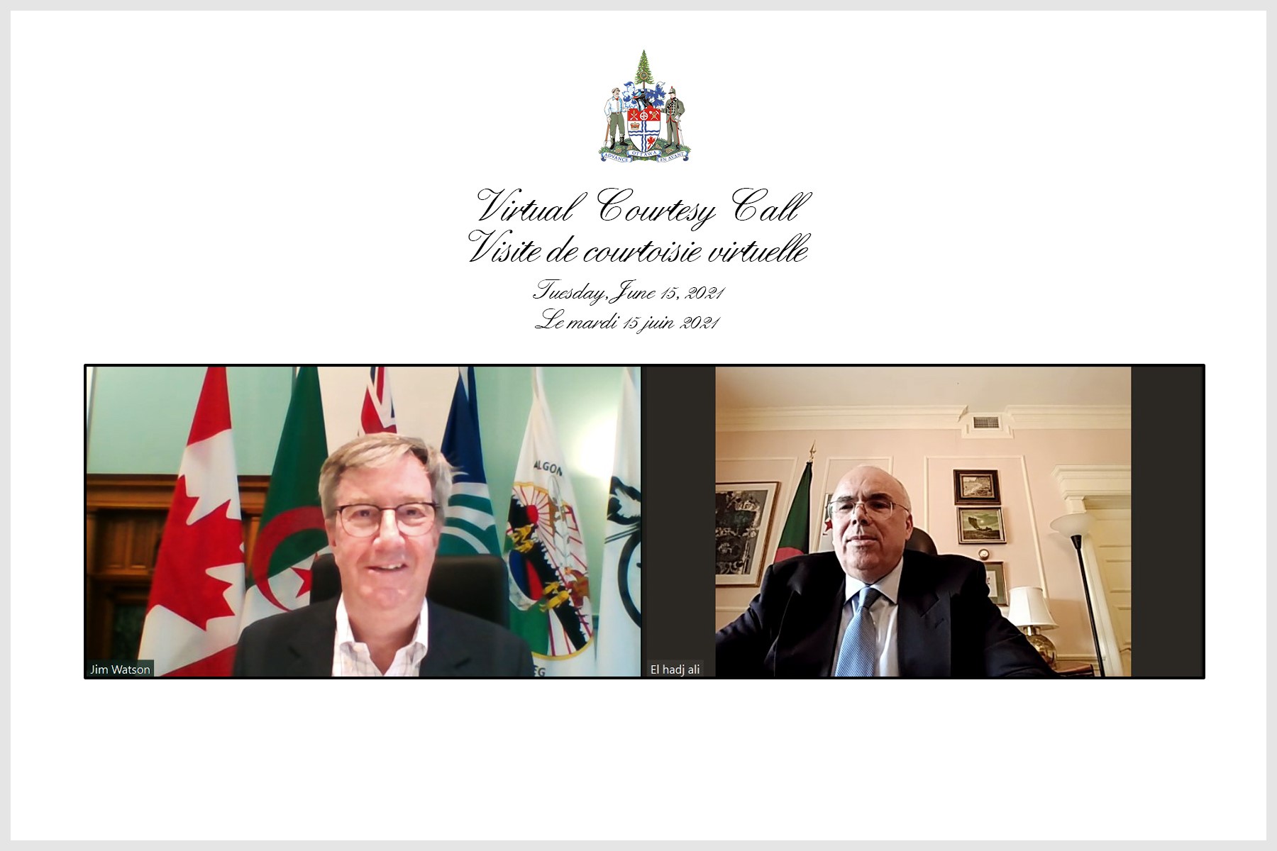 M. l'Ambassadeur a eu, le 15 juin 2021, un entretien avec M. Jim Watson, Maire de la ville d'Ottawa.