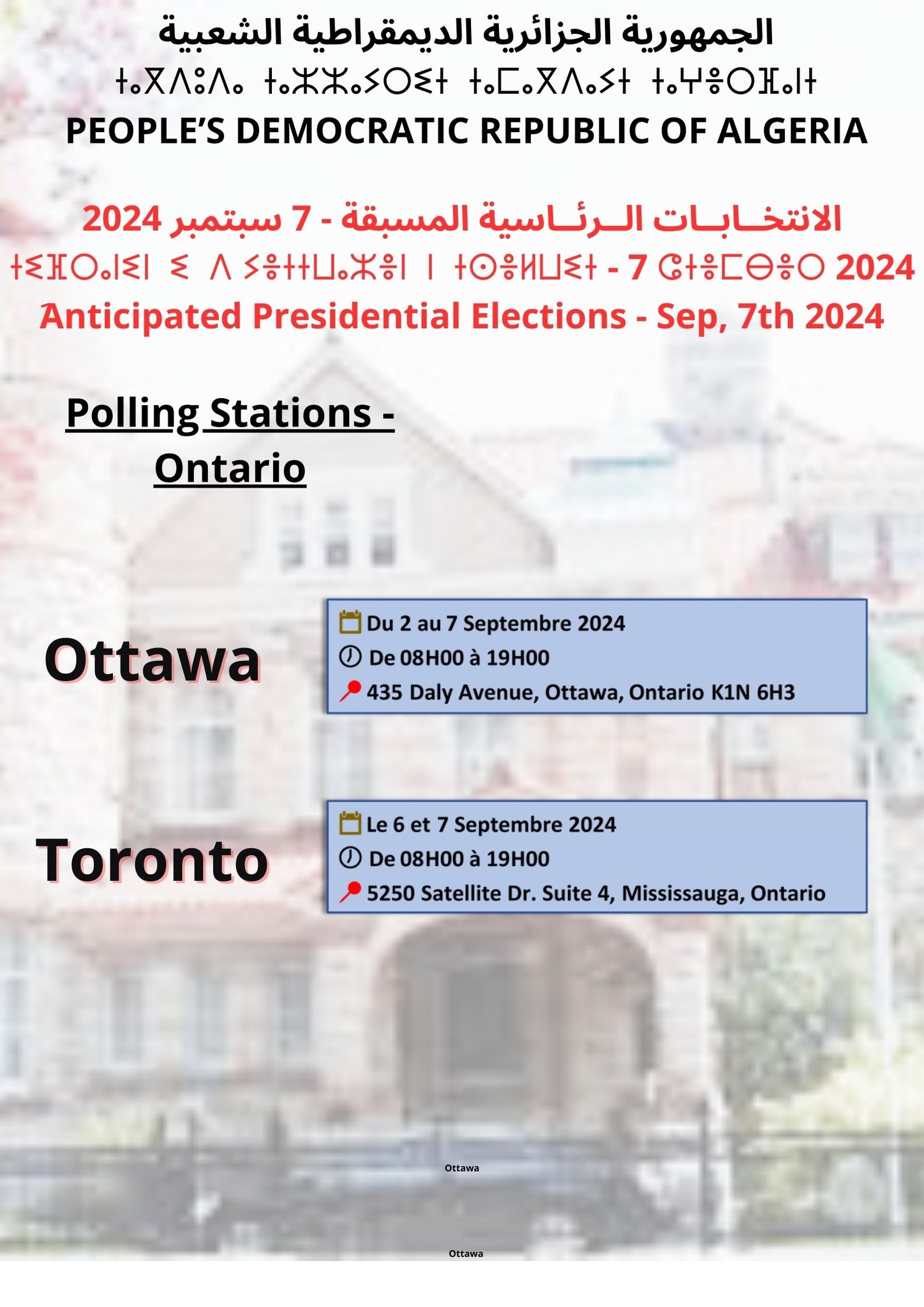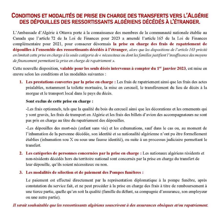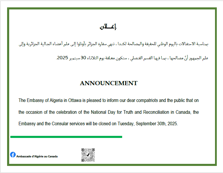 L'ambassade D'Algérie à Ottawa porte à la connaissance de ses compatriotes établis dans sa circonscription