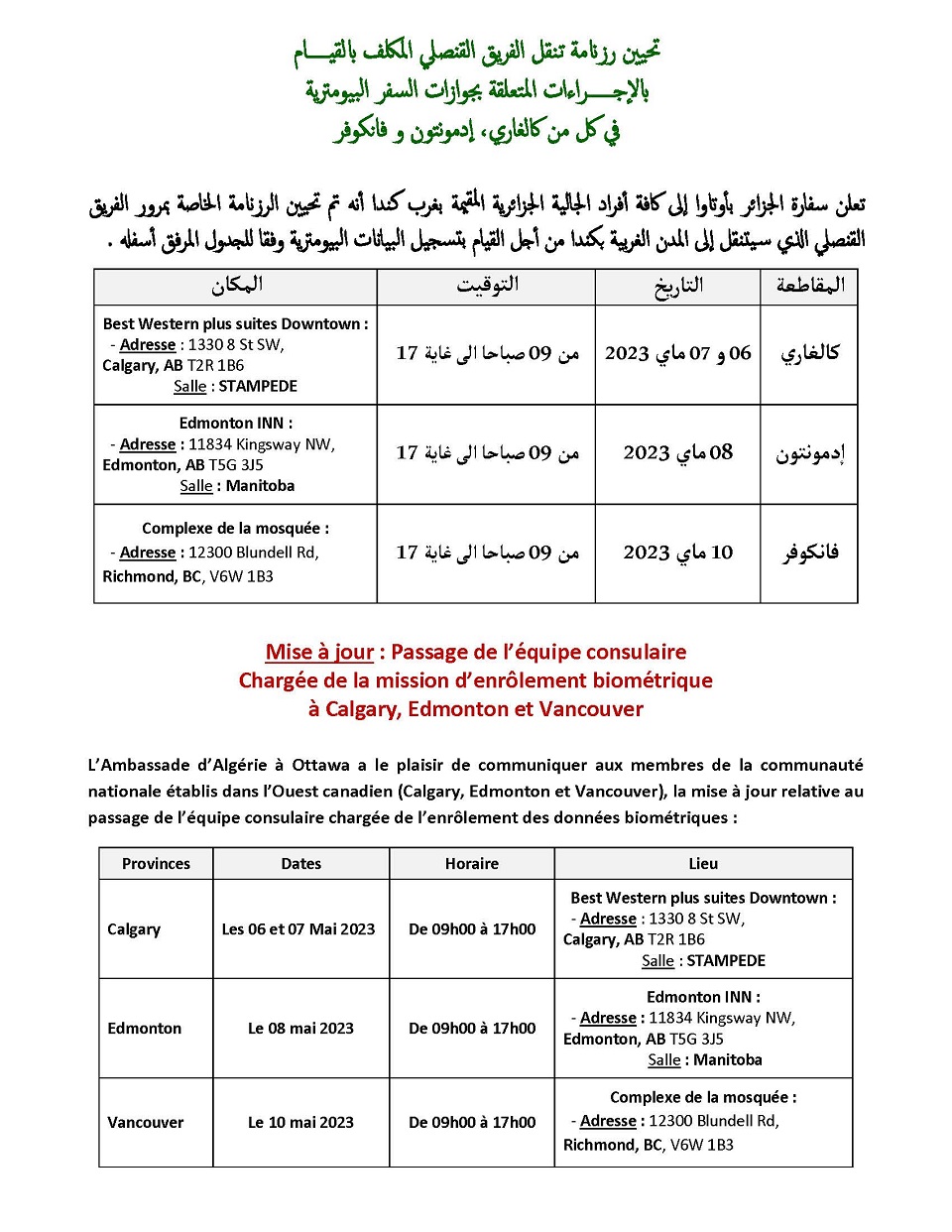 L’Ambassade d’Algérie au Canada a le plaisir d’informer les