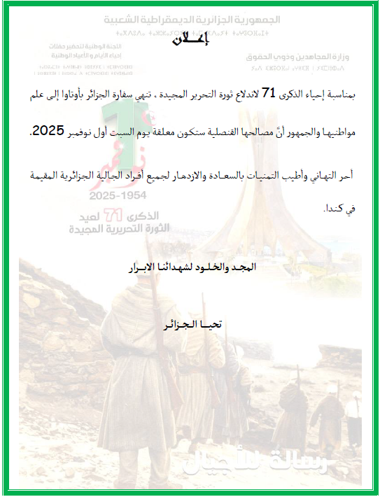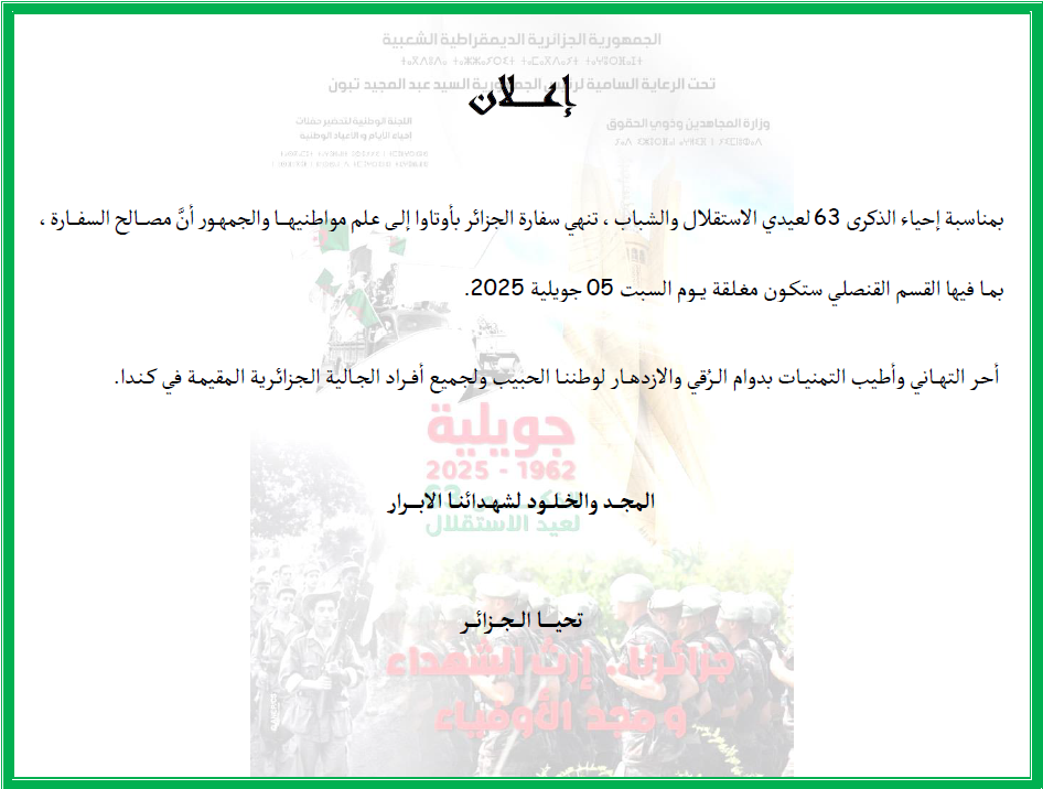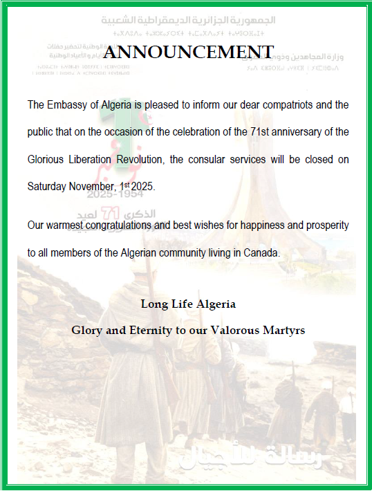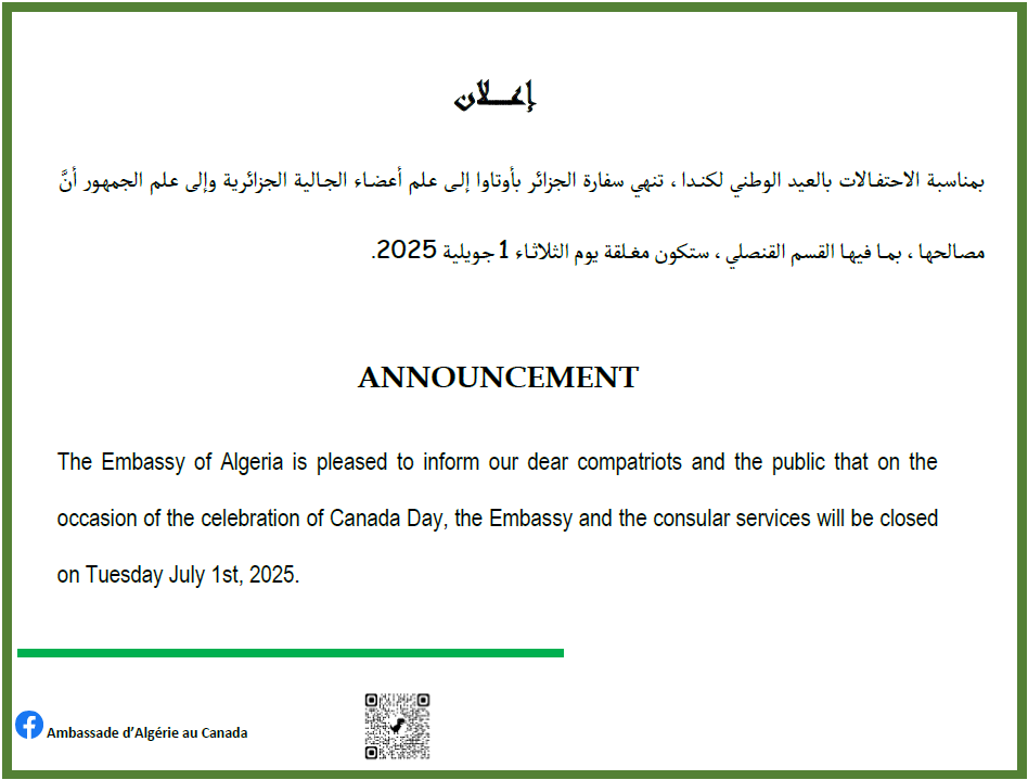 وتؤكد سفارة الجزائر بكندا التزامها التام بمرافقة المواطنين المعنيين إلى غاية البث النهائي في ملفاتهم.