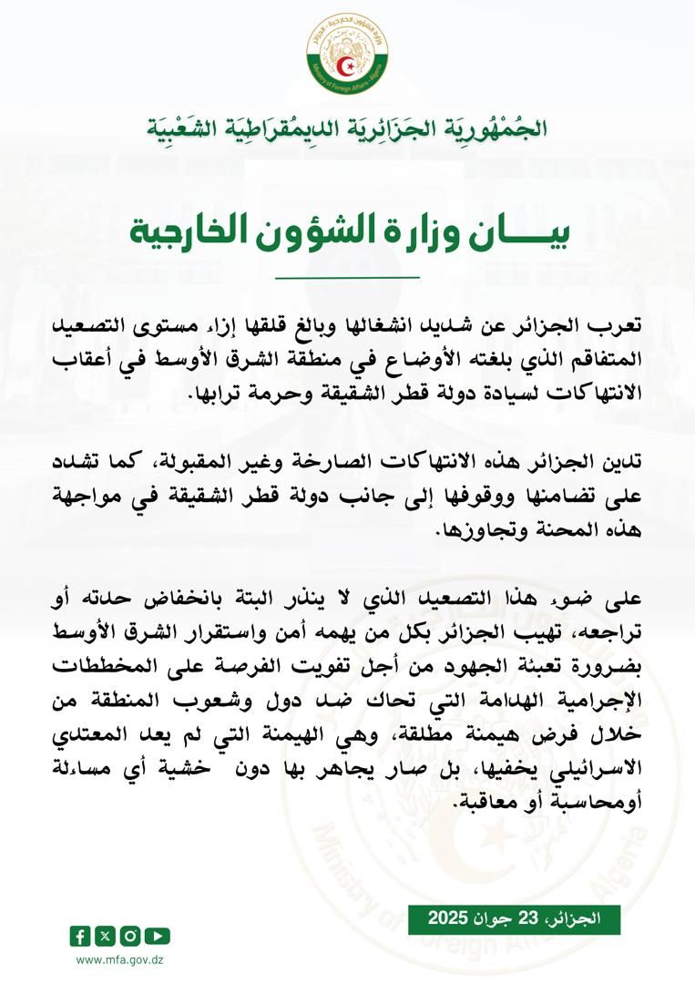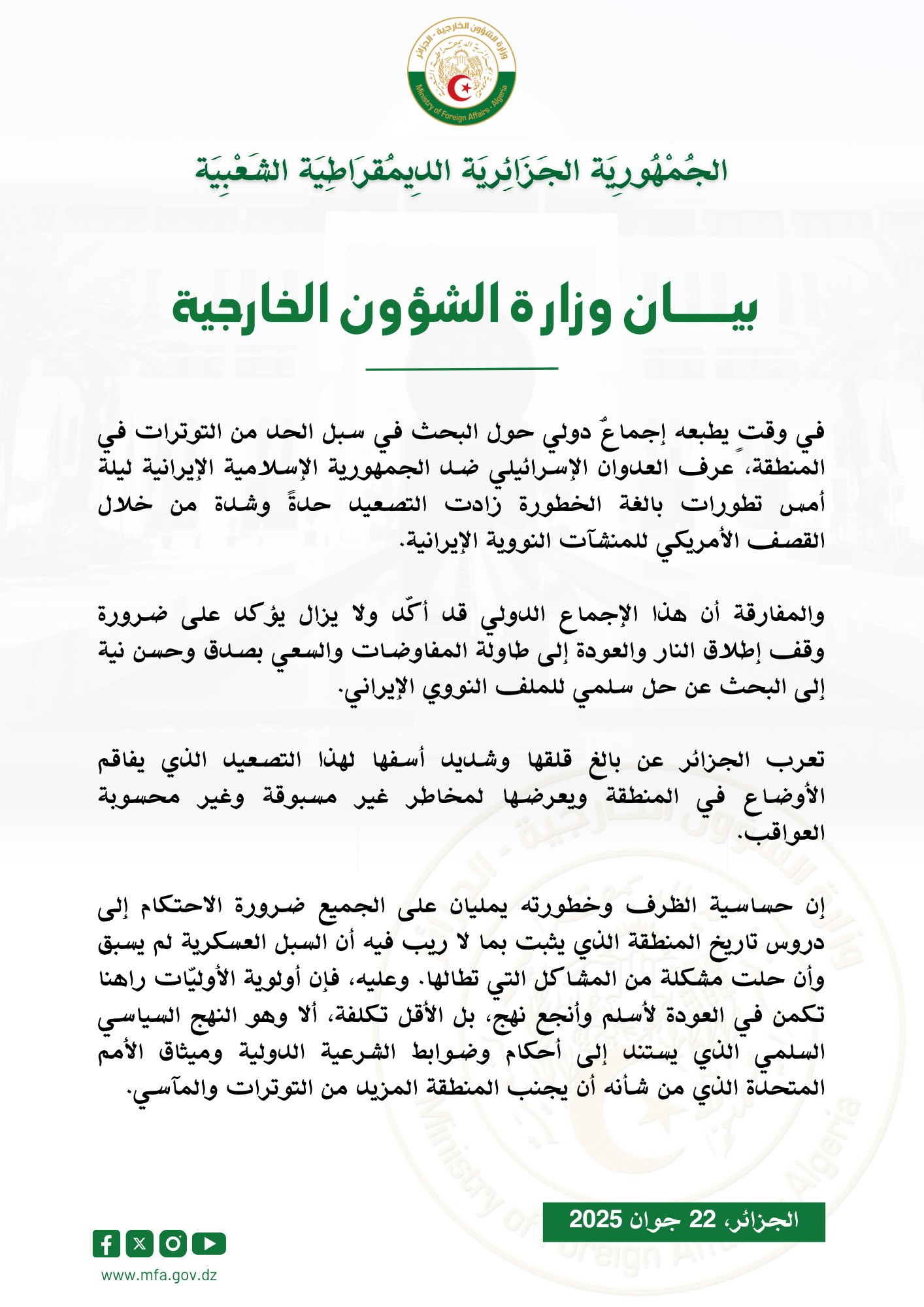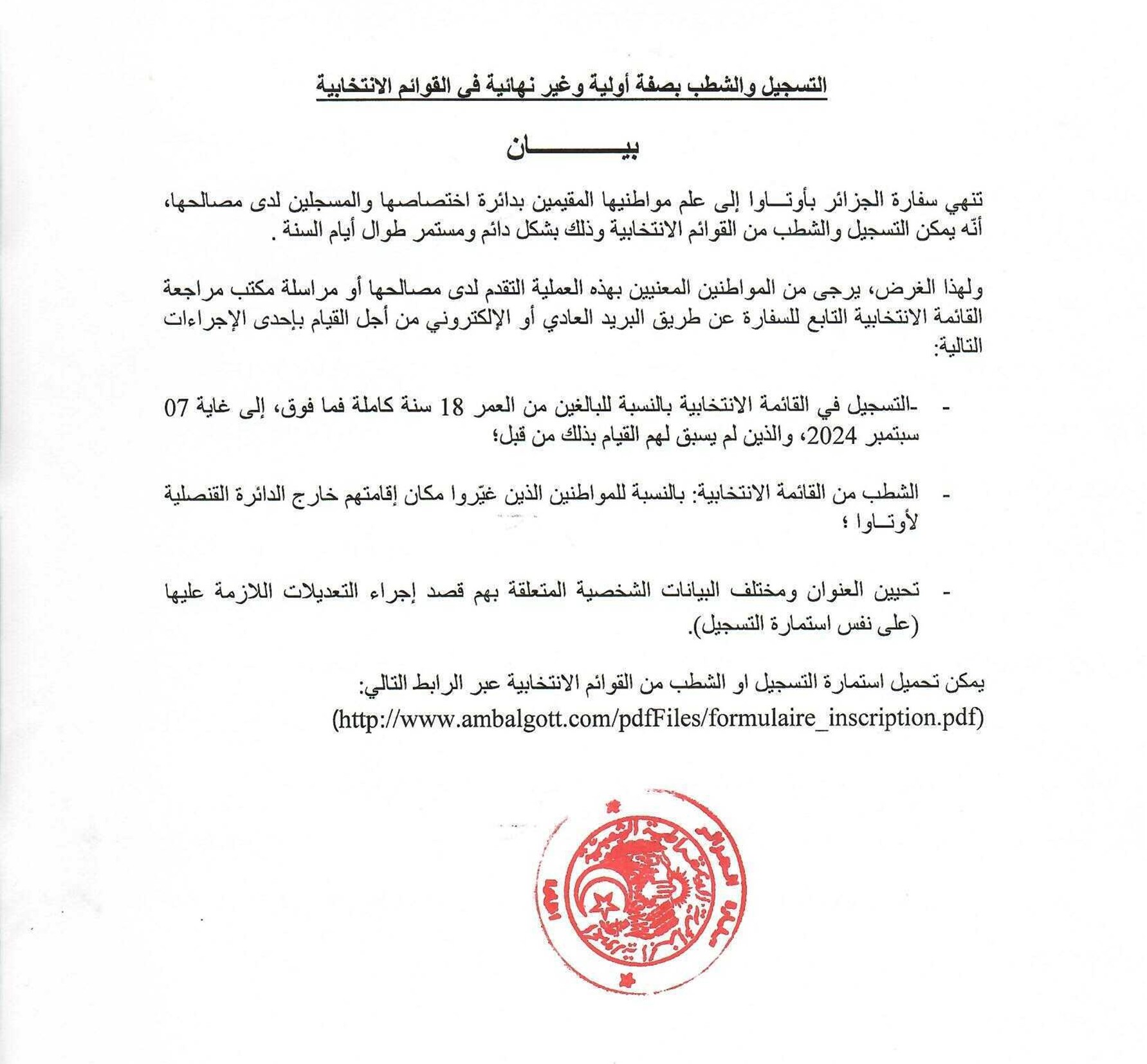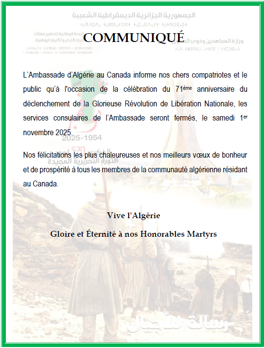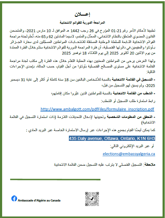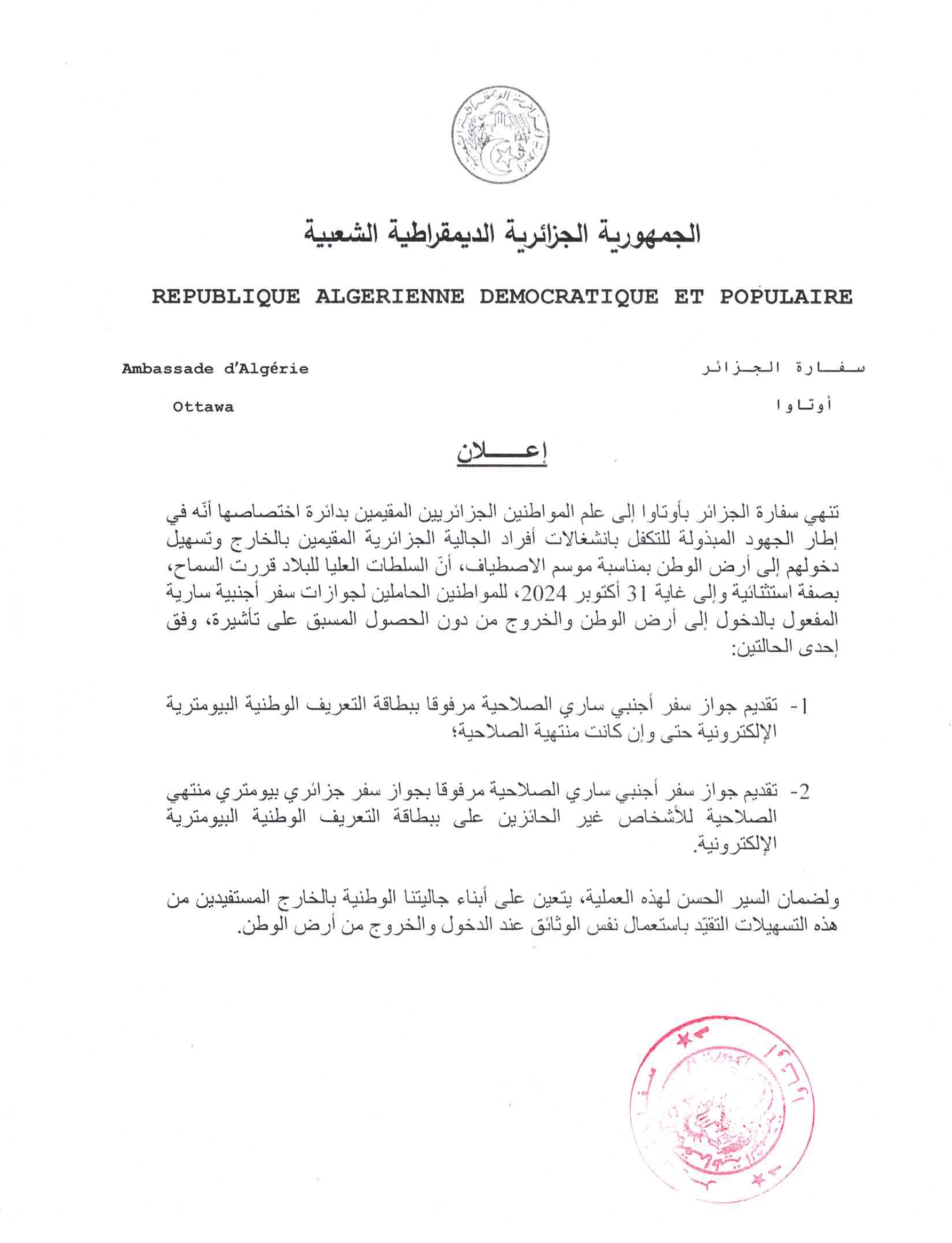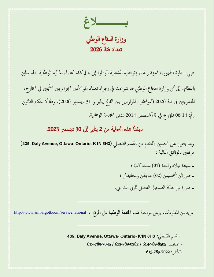 تنفيذا لقرار السيد رئيس الجمهورية عبد المجيد تبون، القاضي بتسوية وضعية المواطنين المتواجدين في الخارج في وضعية هشة وغير قانونية والذين هم محل إجراءات قضائية أو إدارية، تعلم سفارة الجزائر بكندا أعضاء الجالية الوطنية المقيمين في نطاق اختصاصها أنه تم اتخاذ تدابير استثنائية لفائدة المواطنين، لا سيما الشباب، محل متابعات قضائية أو إدارية تتعلق بوقائع جنحية طفيفة تمس بالنظام العام.