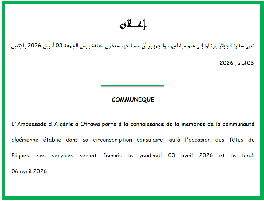 C’est avec un immense plaisir que les personnels de l’Ambassade et moi-même, adressons, à l’ensemble des membres de la communauté algérienne établie au Canada, nos vœux de bonne santé, de prospérité et de réussite, à l’occasion de la célébration de la fête de l’Aid El-Fitr.