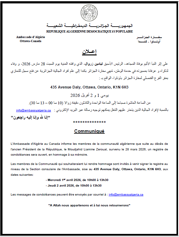 بموجب المرسوم الرئاسي رقم 26-145 المؤرخ في 16 شوال عام 1447 الموافق لـ 04 أفريل 2026، المتضمن استدعاء الهيئة الناخبة لانتخاب أعضاء المجلس الشعبي الوطني يوم الخميس 02 جويلية 2026 و عملا بأحكام الأمر رقم 21-101 المؤرخ 26 رجب عام 1442 الموافق لـ 10 مارس سنة 2021 المتضمن القانون العضوي المتعلق بقانون الانتخابات المعدل والمتمم، لا سيما المادتان 62 و 65 منه، تنهي سفارة الجمهورية الجزائرية الديمقراطية الشعبية بأوتاوا إلى علم أفراد جاليتها المقيمين بدائرة إختصاصها، أنه سيتم إجراء مراجعة استثنائية للقوائم الانتخابية: