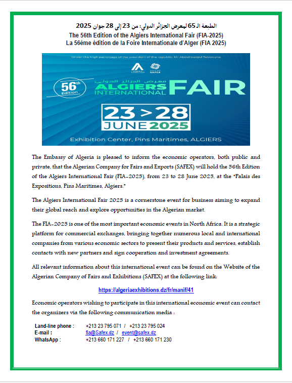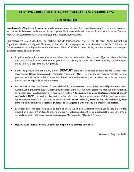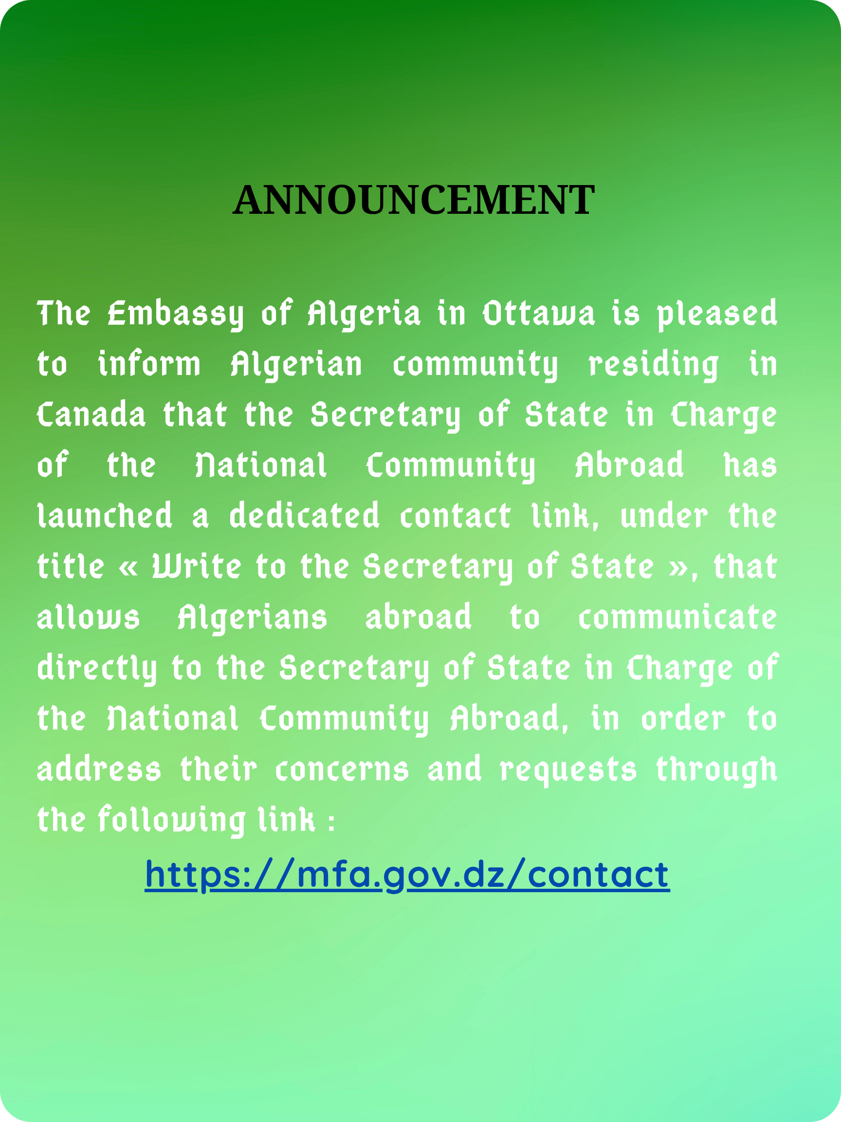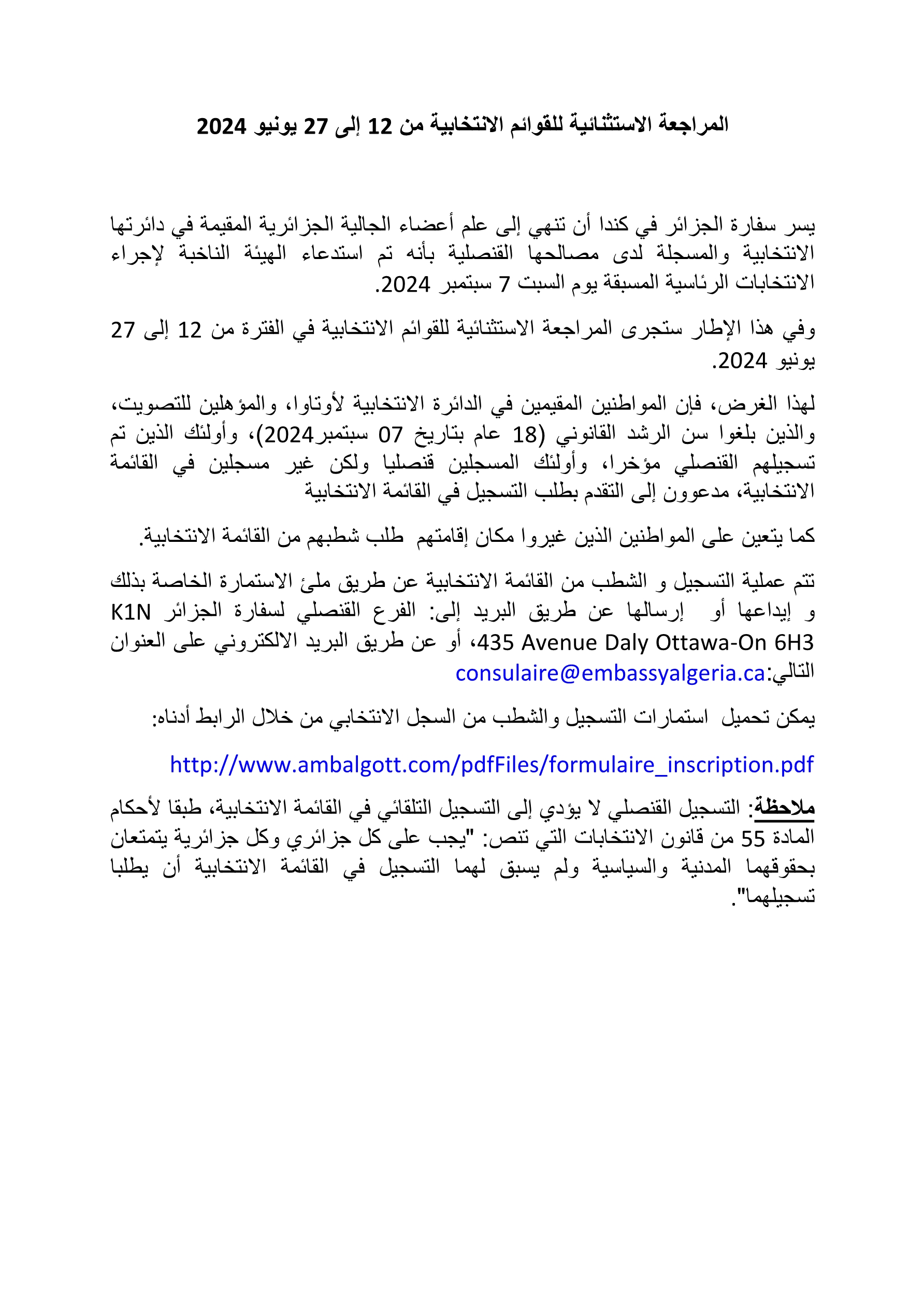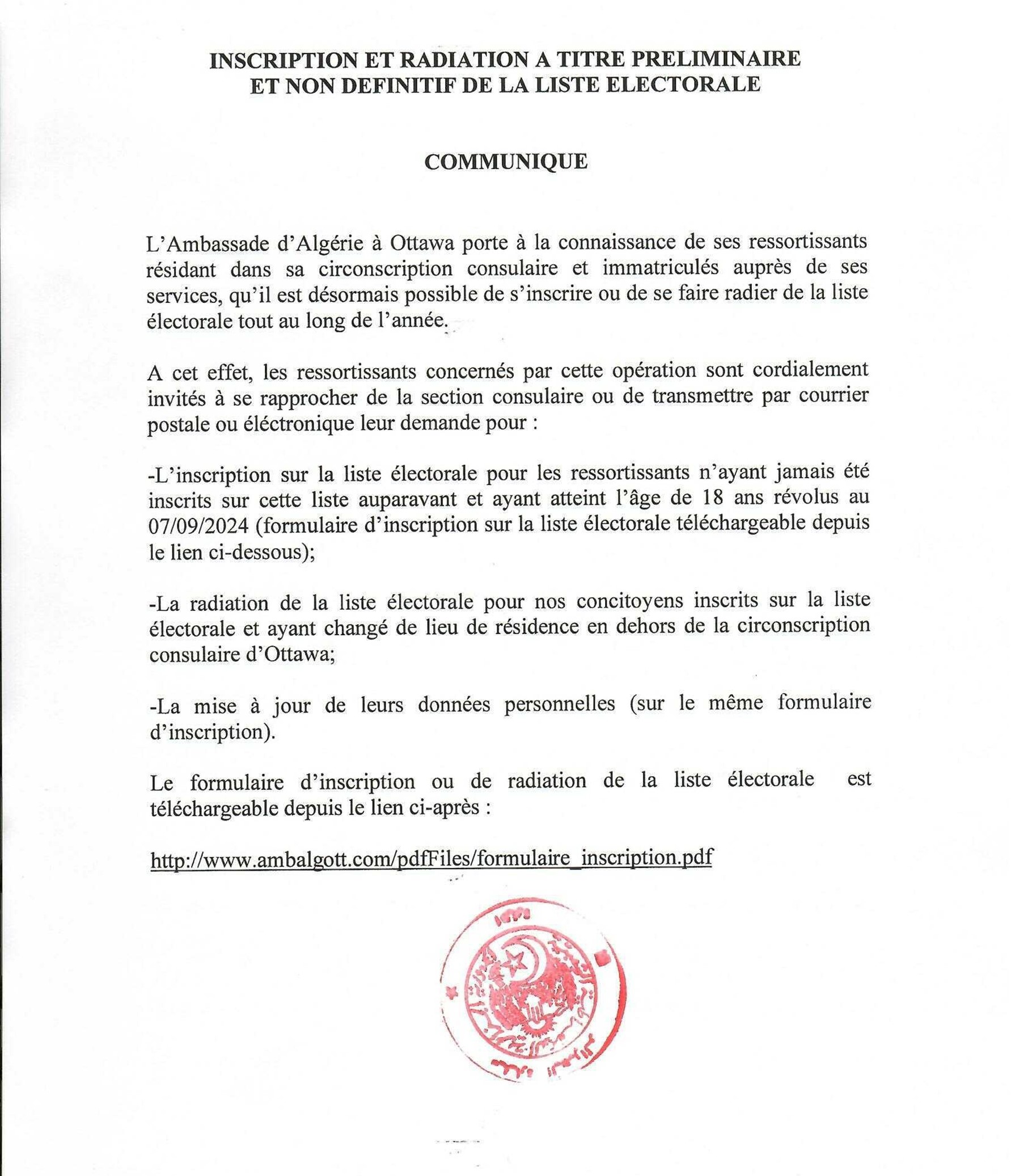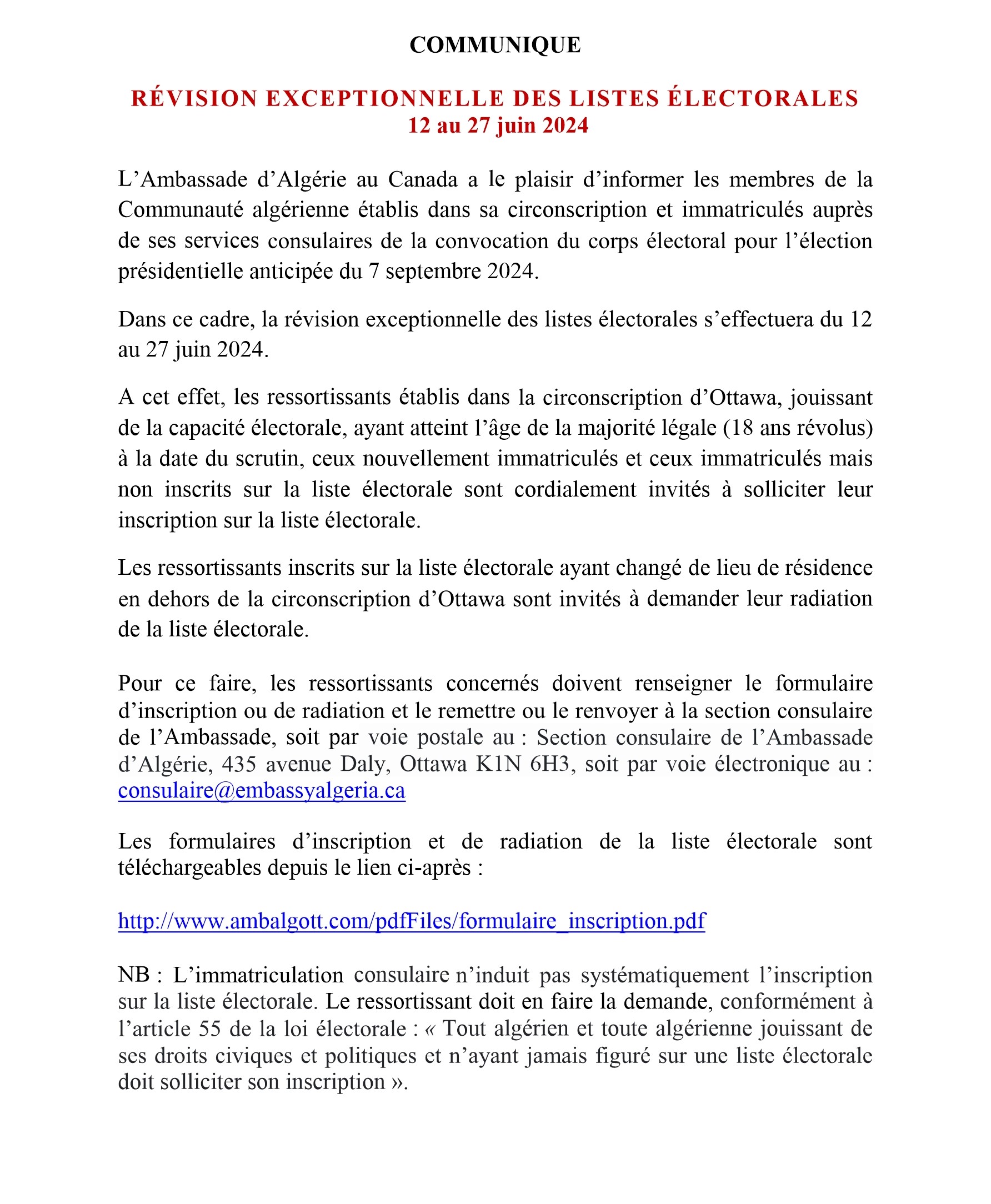 L’Ambassade d’Algérie à Ottawa demeure à la disposition des citoyens concernés pour les accompagner dans leurs démarches jusqu’au traitement final de leurs dossiers.
