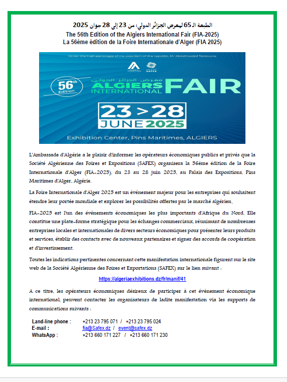l'Algérie aux manifestations économiques à l'étranger au titre de l'année 2024, l'Algérie prendra part au Salon International de